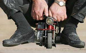 在德國萊比錫舉行的摩托車展示會上,一名騎著普通摩托車的女子觀看一輛2公斤重的迷你摩托車。這種摩托車只有人腳大小,時速卻可達(dá)到20公里。